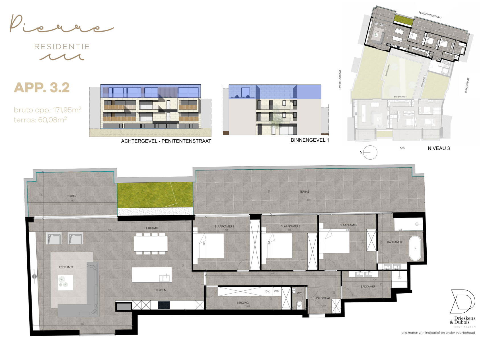La résidence « Pierre » a été conçue dans un souci d'espace, d'intimité et de durabilité. Ce projet à petite échelle comprend un mélange d'appartements de 2 et 3 chambres à coucher, convenant aux jeunes et aux moins jeunes. Chaque appartement est conçu dans un souci de lumière, de confort et d'architecture moderne, avec le magnifique jardin de la cour et de généreuses ouvertures de fenêtres reliées aux terrasses ensoleillées uniques avec une vue unique, entre autres, sur le jardin tubulaire. Grâce à des caractéristiques durables telles que le chauffage par le sol et les panneaux solaires, vous vivrez ici avec une empreinte écologique minime (Epeil < 30) et un confort maximal. Pour la commodité et le confort de chaque résident, un spacieux abri à vélos et un parking souterrain optionnel + salle de stockage sont disponibles. À la Residentie Pierre, vous vivez à quelques pas du centre-ville, à proximité d'agréables terrasses, de commerces et d'activités culturelles.