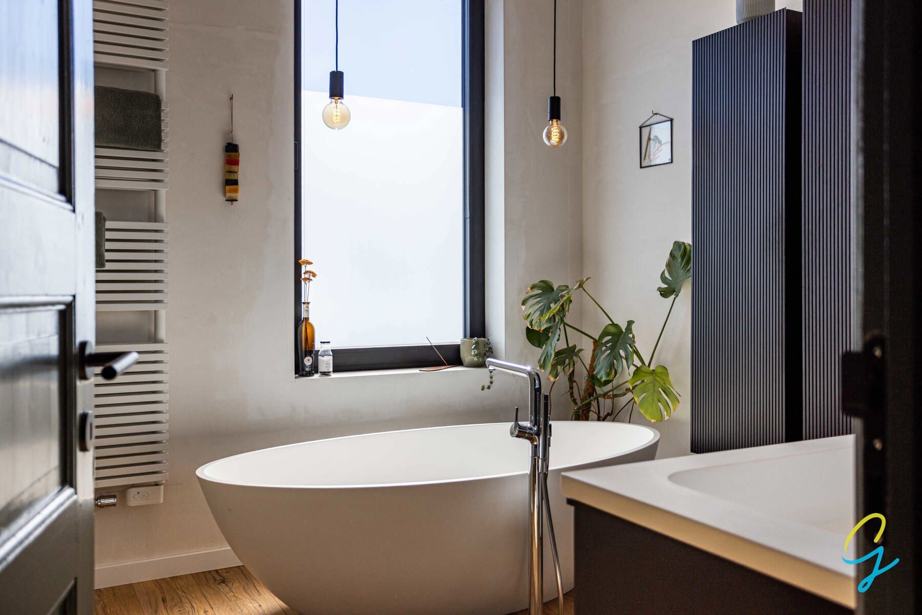 Au premier étage se trouvent une chambre spacieuse et une salle de bains luxueuse avec douche à l'italienne, baignoire îlot et meuble-lavabo double.
