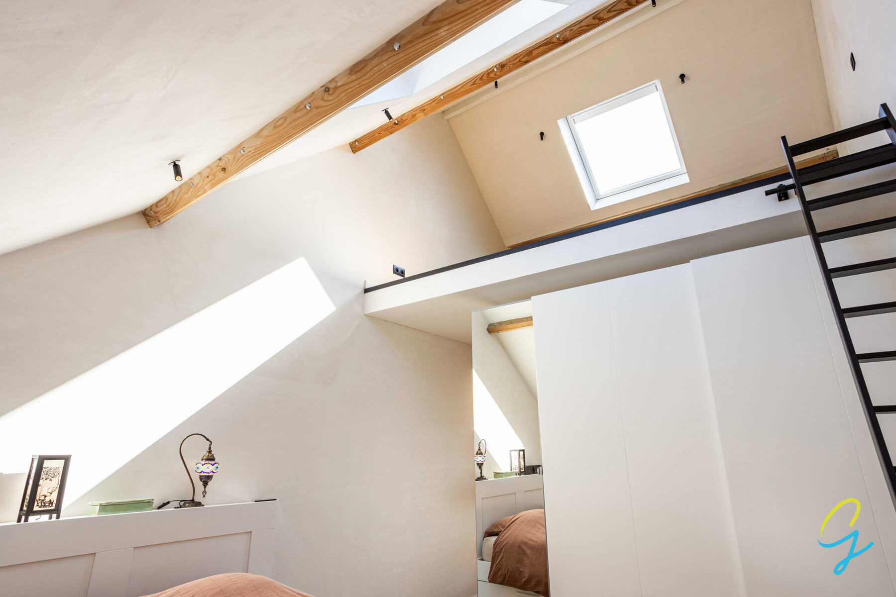 Le deuxième étage a été entièrement ouvert et sert actuellement de chambre principale avec dressing, espace loisirs et mezzanine.