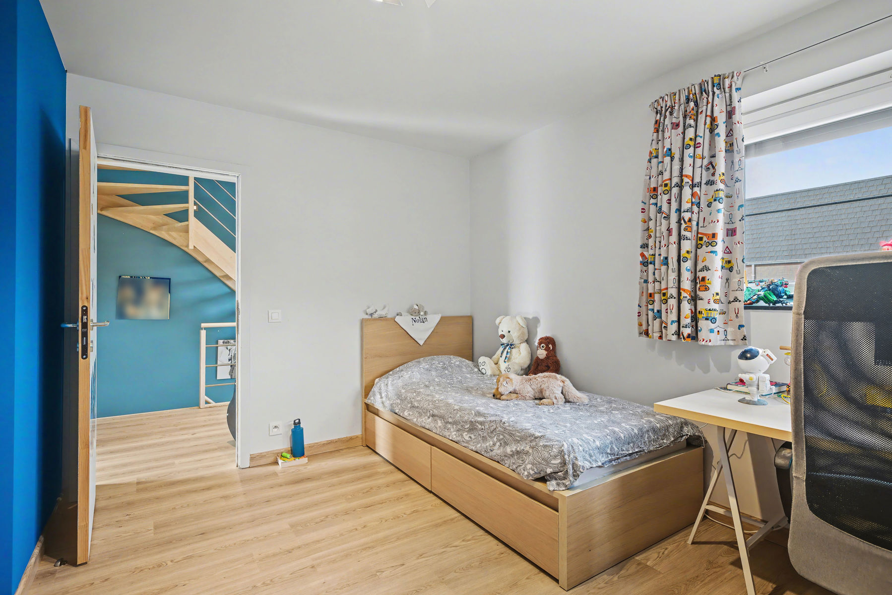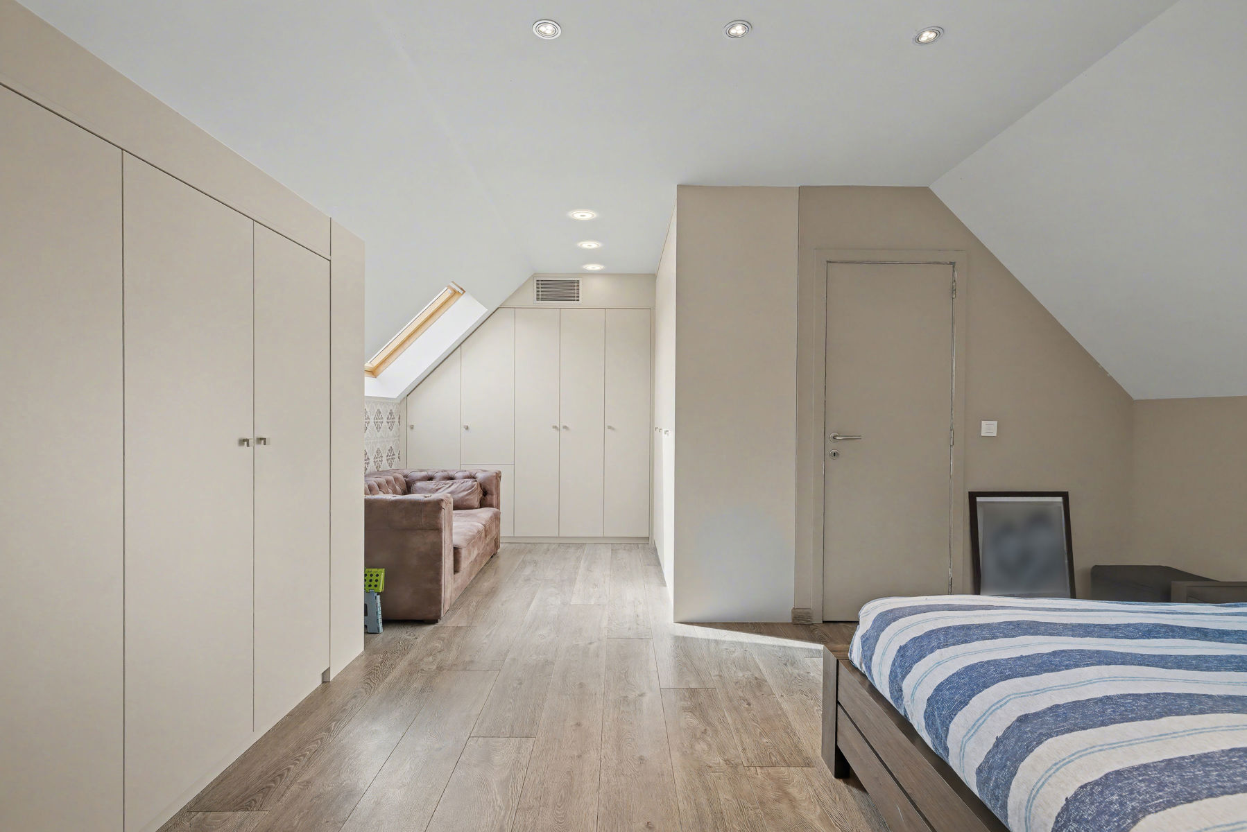 Au deuxième étage, accessible par un escalier fixe, se trouve la chambre principale avec ses nombreux placards intégrés.
