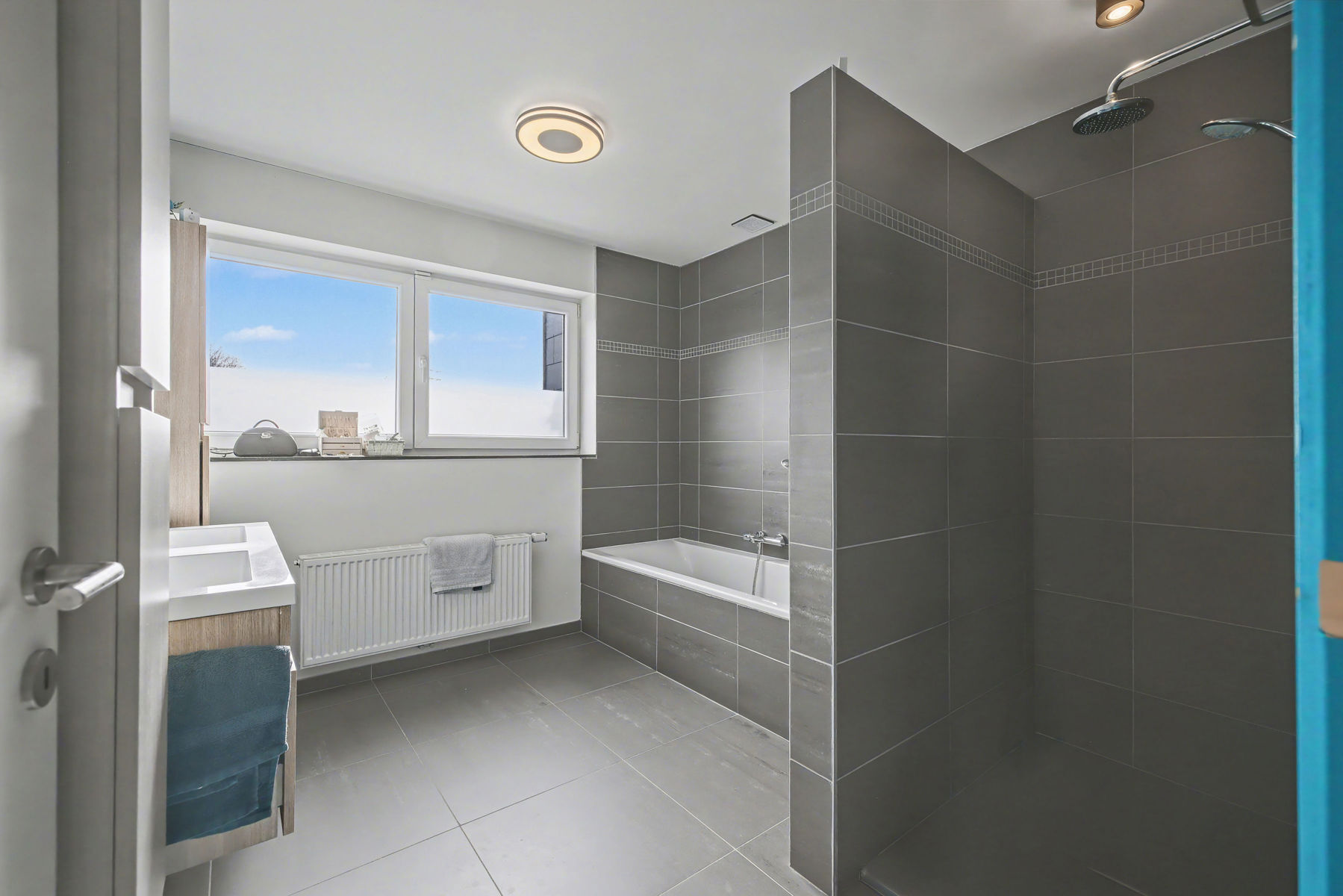 Le premier étage comprend deux chambres spacieuses, une salle de bains moderne avec baignoire, douche à l'italienne et double lavabo, ainsi que des toilettes séparées.