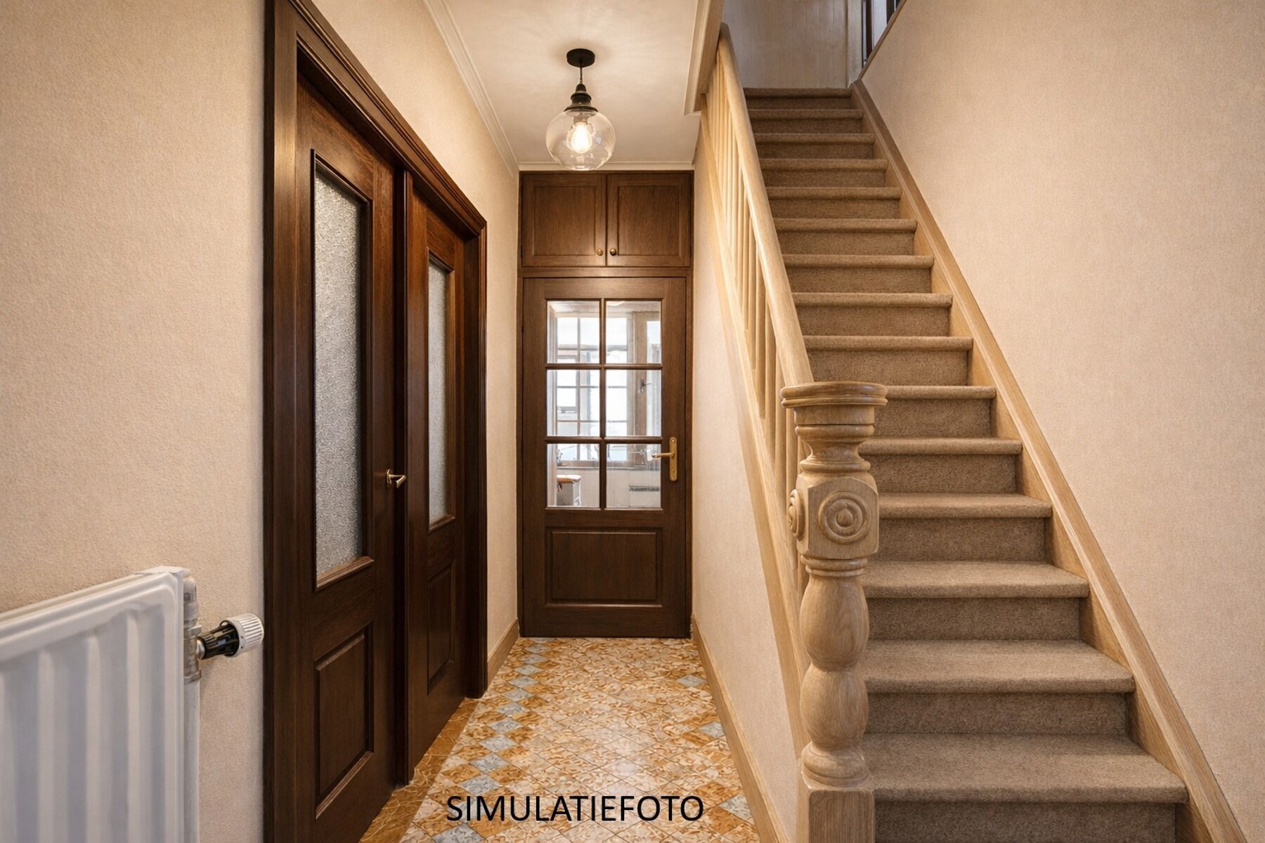 Style architectural authentique avec une façade en brique pleine de caractère et un toit en bâtière classique.