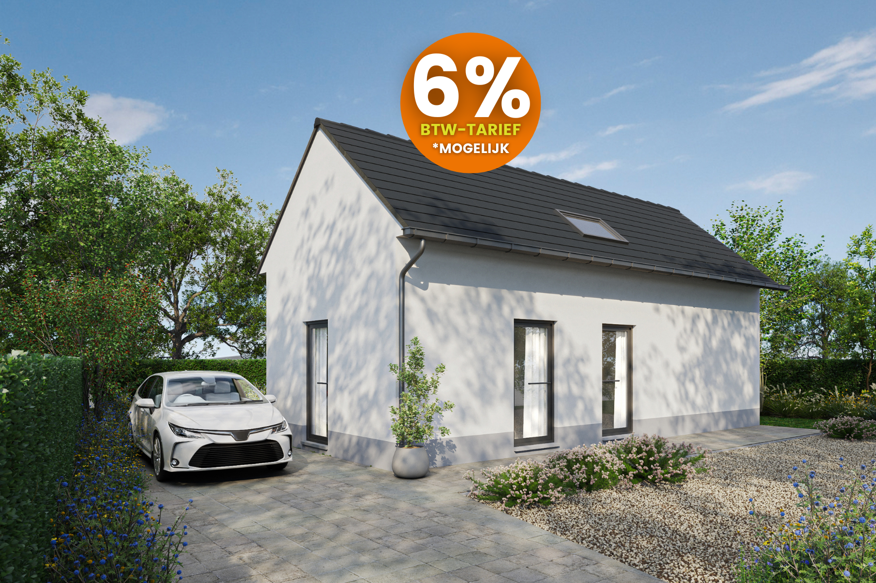 La maison dispose d'un hall d'entrée avec vestiaire et toilettes pour invités. Le salon lumineux s'intègre parfaitement à la cuisine ouverte avec débarras attenant et se caractérise en outre par un escalier ouvert menant à l'étage supérieur. Depuis le salon, vous pouvez profiter d'une belle vue sur la terrasse et le jardin, qui sont également directement accessibles. Un parking pavé est prévu sur la façade gauche.