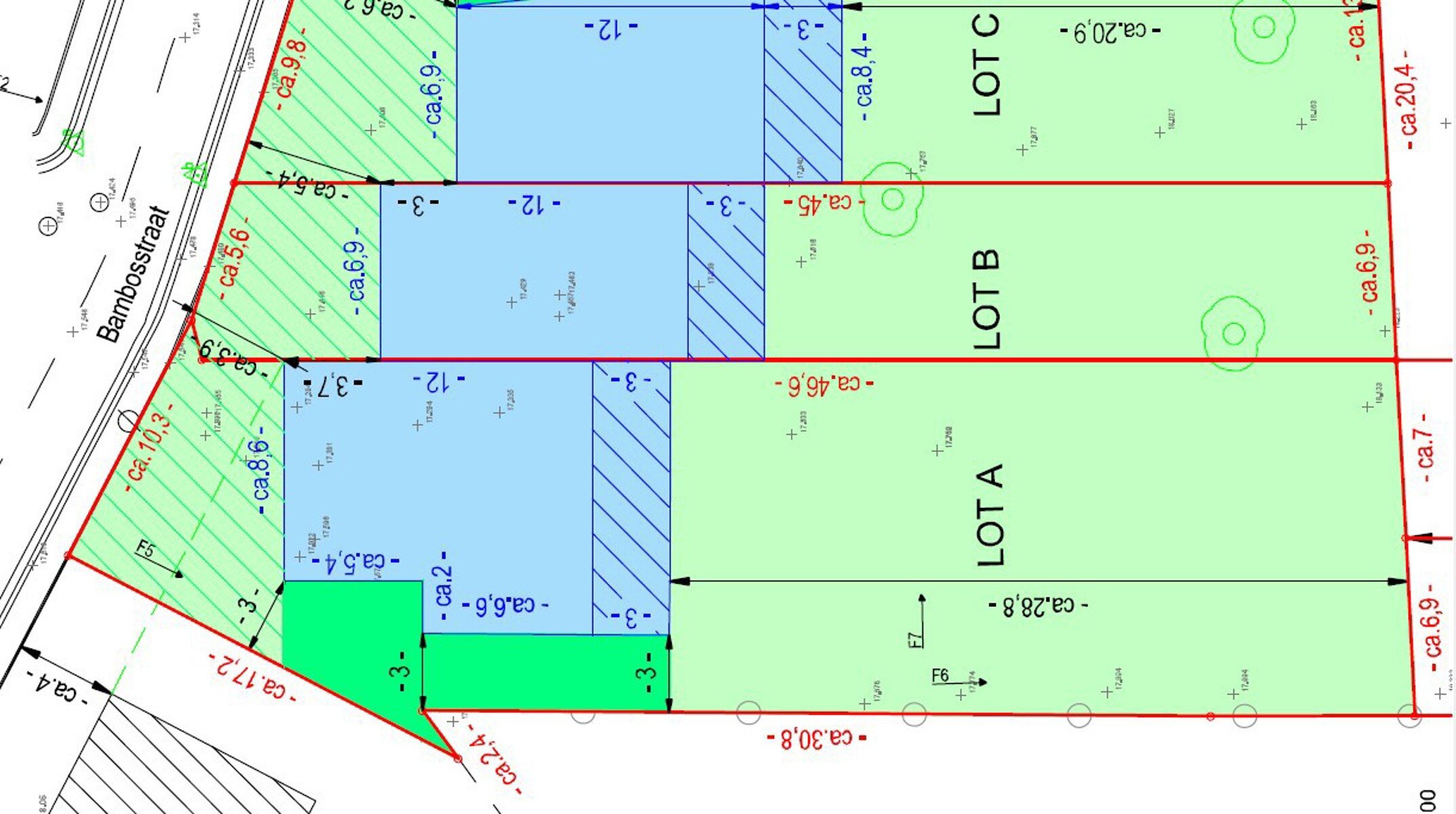 Dit perceel is 6.70 are groot, heeft een straatbreedte van 10.3meter met een half open bebouwing die aan de voorgevel 8.6m breed mag zijn maar daarna nog ruimer wordt.