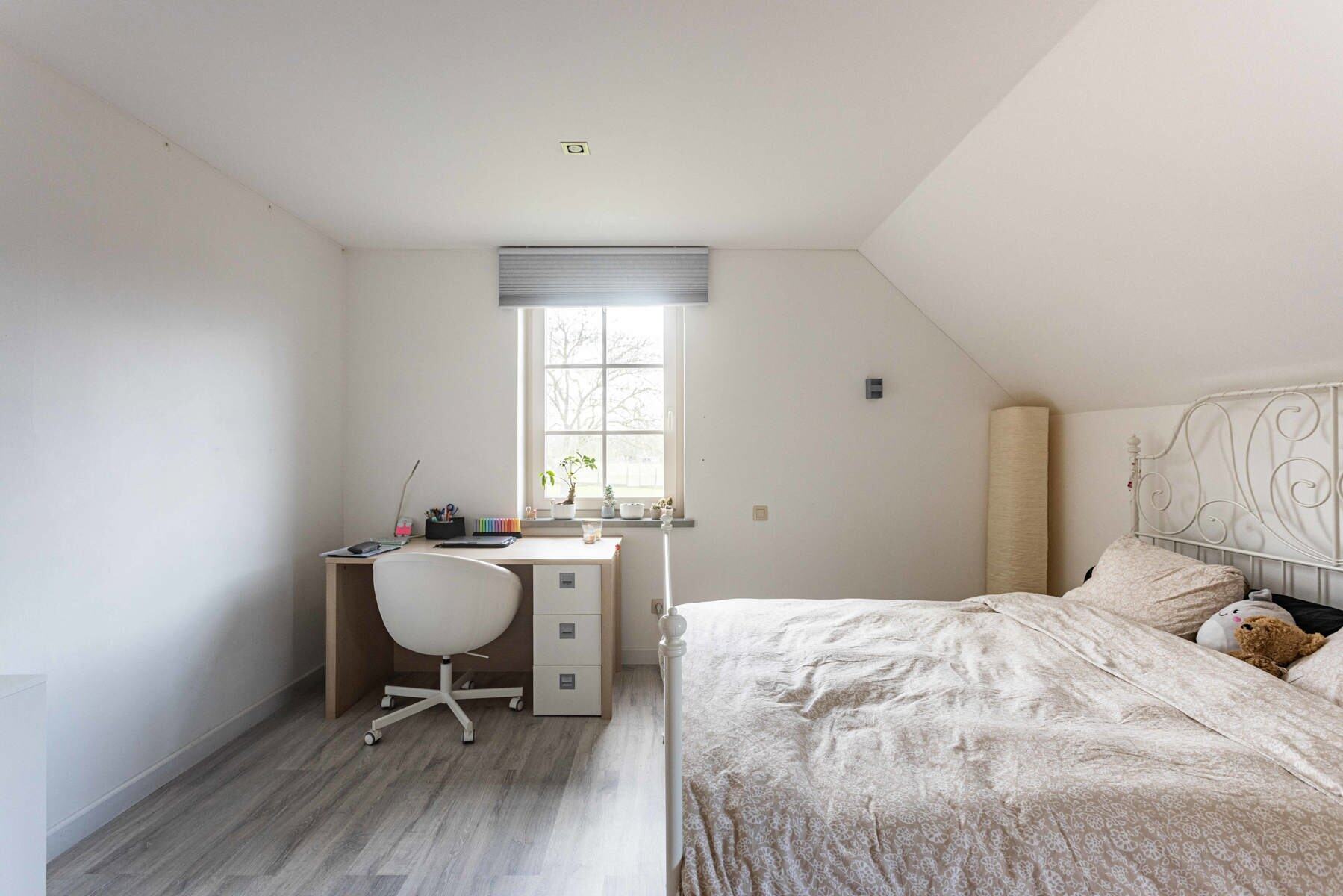 Via de inkomhal met gastentoilet betreedt u de woning. Op het gelijkvloers vindt u verder een bureauruimte, een praktische berging, een eetplaats en een open, volledig uitgeruste keuken. De grote raampartijen zorgen voor een overvloed aan daglicht en creëren een mooie connectie met de tuin.