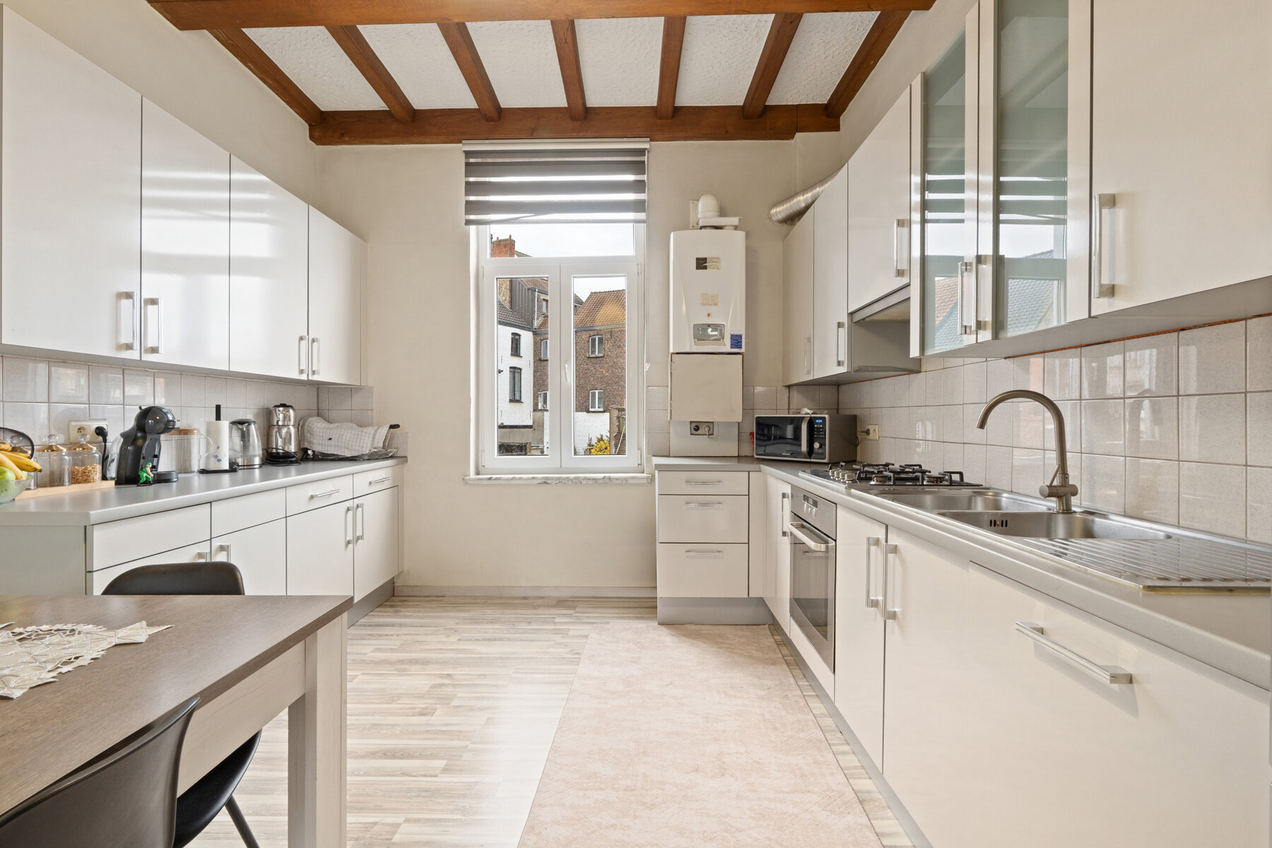 Eerste verdieping: lichtrijke leefruimte met gezellige woonkamer, eetplaats en ingerichte keuken.