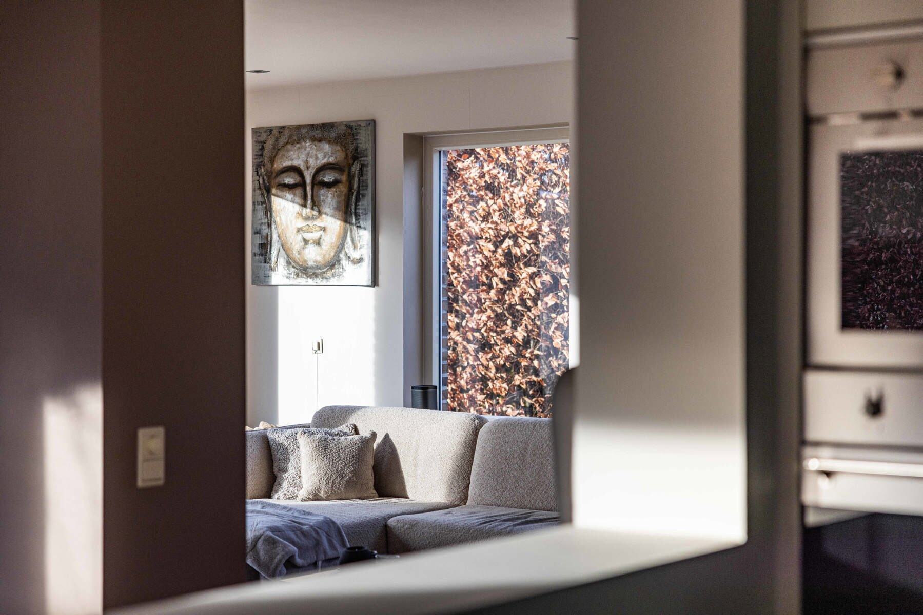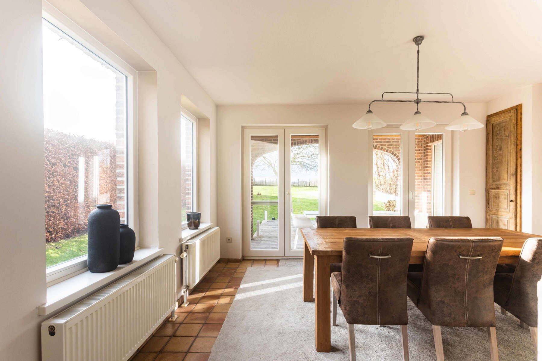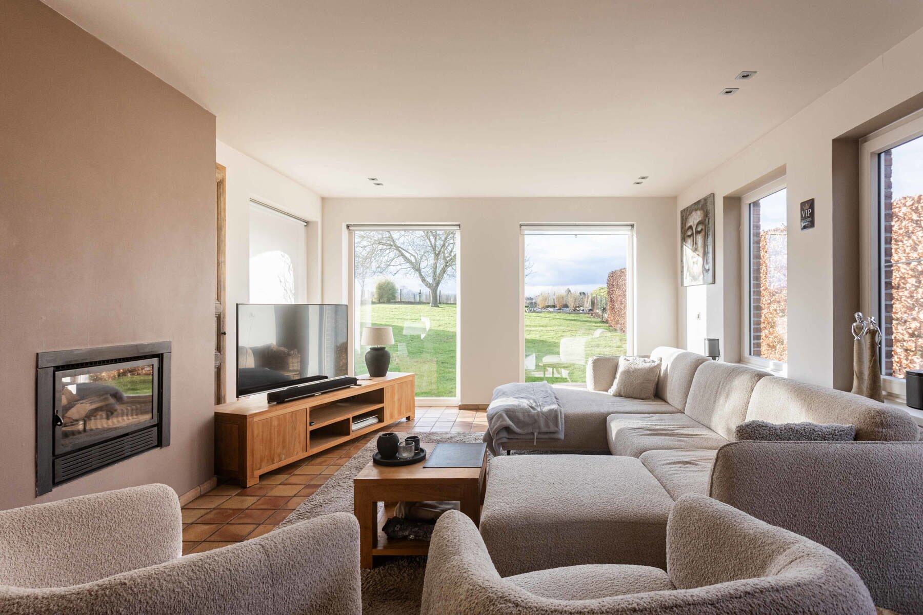 Via de inkomhal met gastentoilet betreedt u de woning. Op het gelijkvloers vindt u verder een bureauruimte, een praktische berging, een eetplaats en een open, volledig uitgeruste keuken. De grote raampartijen zorgen voor een overvloed aan daglicht en creëren een mooie connectie met de tuin.