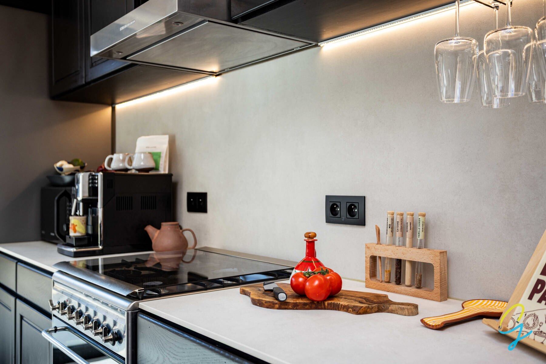 Bij het binnenkomen valt meteen de verzorgde inkomhal met ingebouwde kasten en praktische berging op. De woning is afgewerkt met een gegoten polybetonvloer met vloerverwarming, wat zorgt voor een strak en tijdloos geheel.