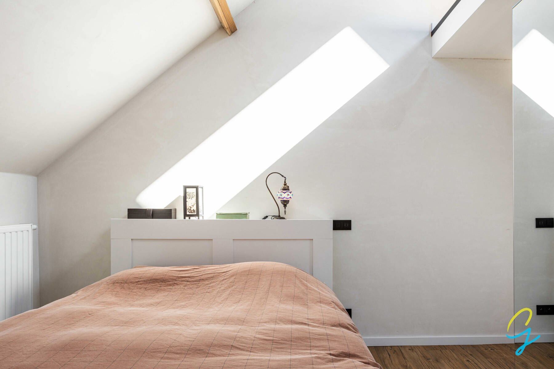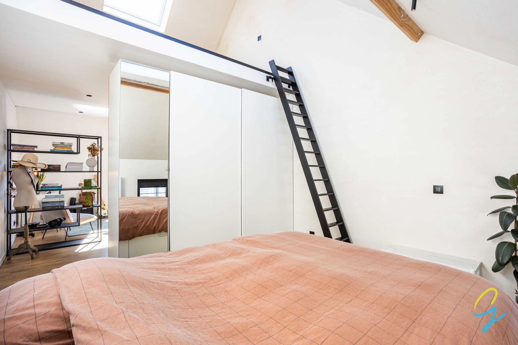 De tweede verdieping werd volledig opengewerkt en doet momenteel dienst als master bedroom met dressing, hobbyruimte en mezzanine.