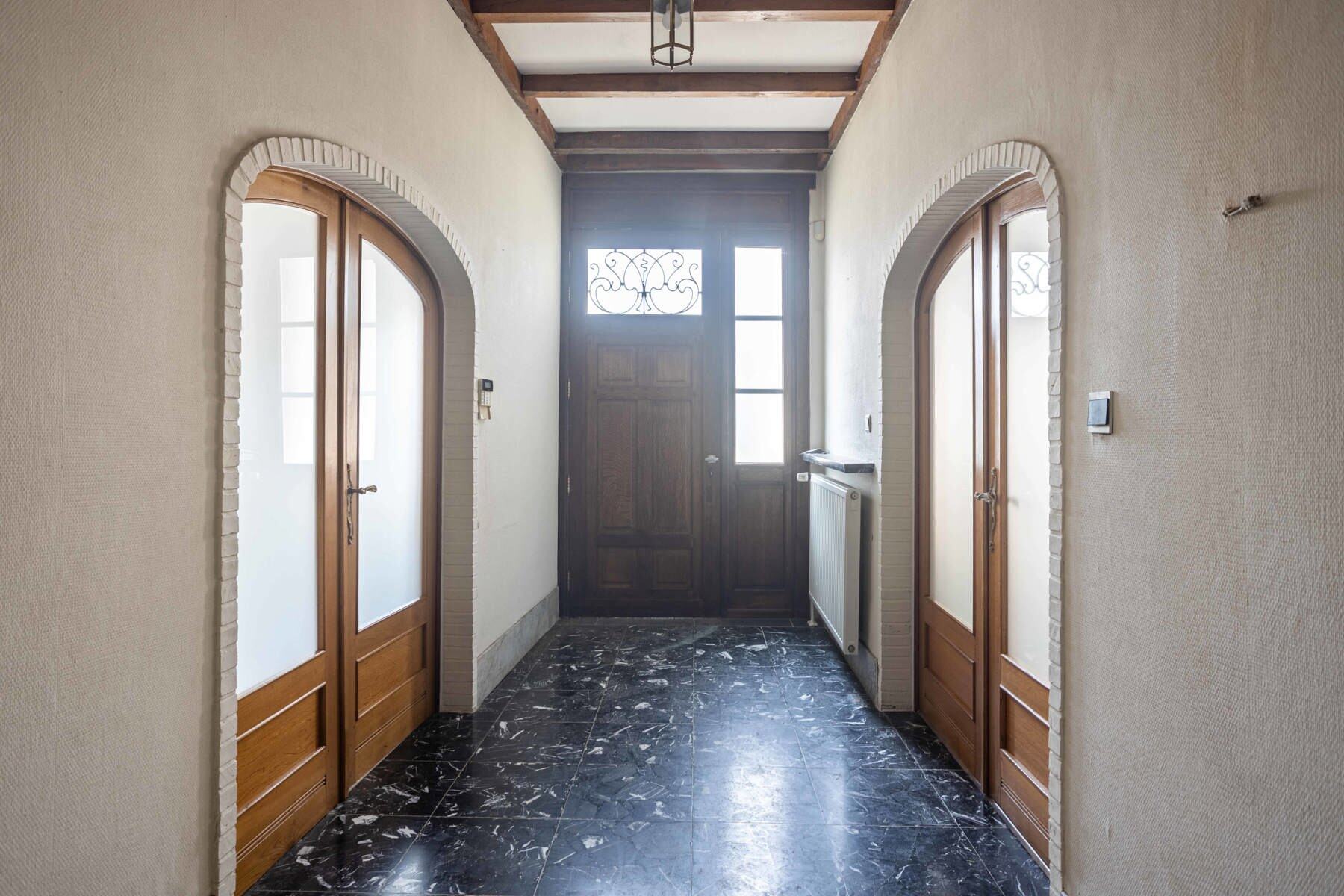 Deze woning betreedt u via de stijlvolle inkomhal met aan de rechterzijde een bureelruimte en links de woonruimte badend in het licht met aansluitende de keuken van waaruit u zicht heeft op de tuin en het park. Verder op het gelijkvloers een bergruimte, afzonderlijk toilet en “werkatelier”. Deze polyvalente ruimte is vanop straat toegankelijk via de (op de foto witte) poort en biedt ook een toegang tot de tuin.