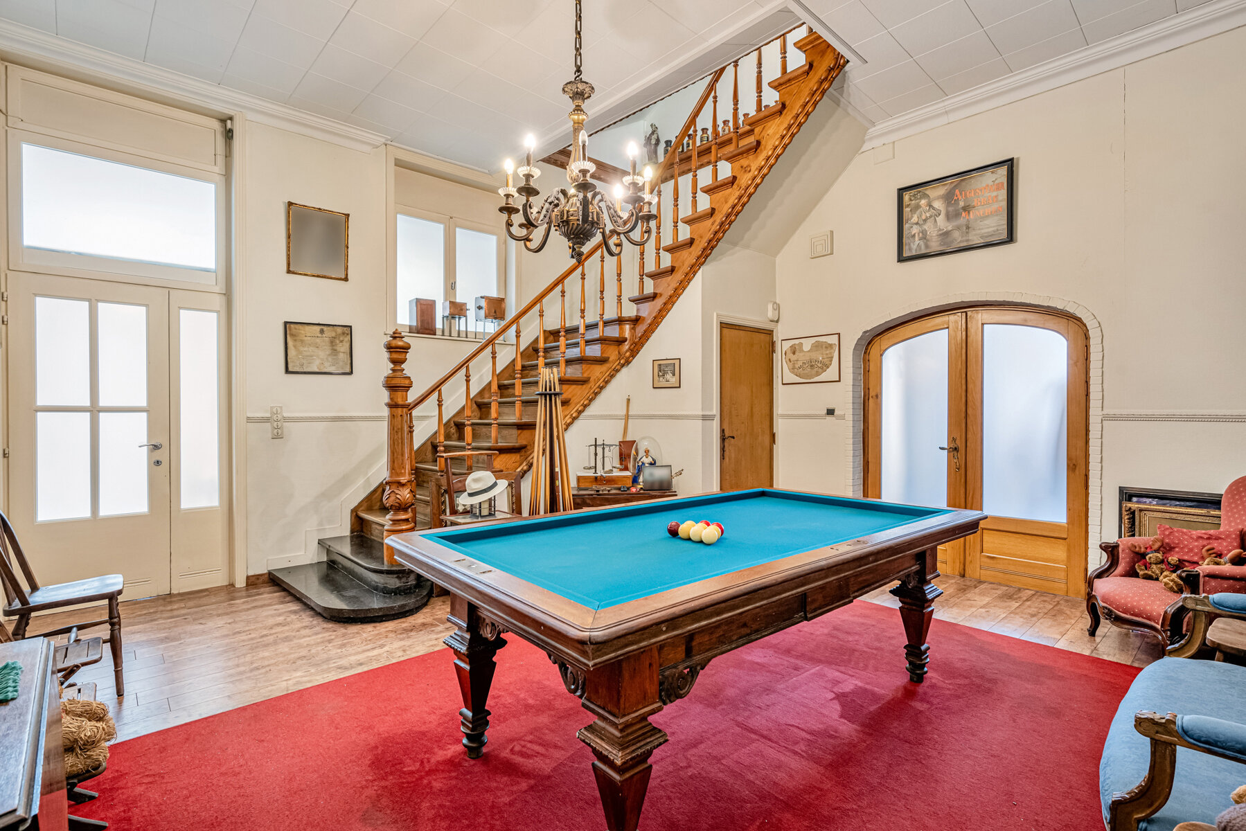 Via de imposante traphal/biljartruimte met prachtige eiken trap komt u op de eerste verdieping met ruime nachthal en maar liefst 4 slaapkamers en twee badkamers.