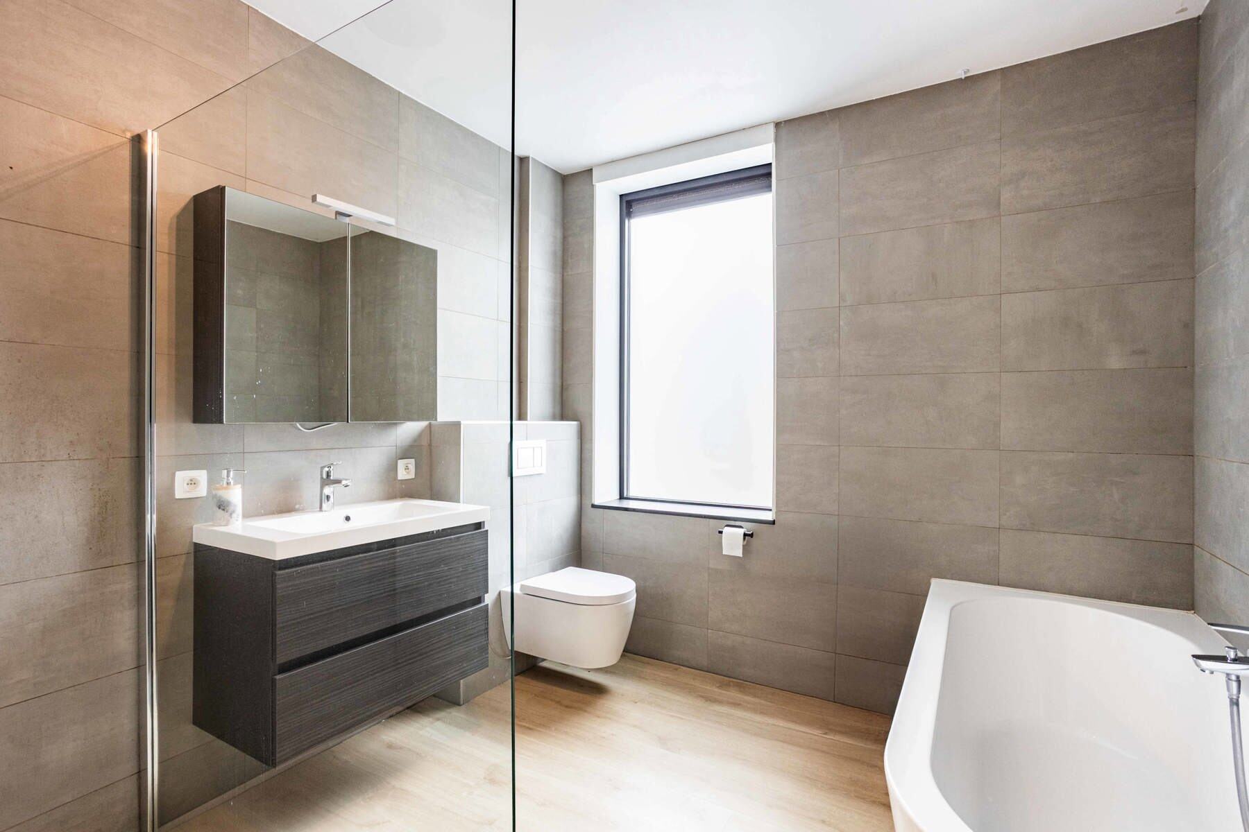 Op het eerste verdiep bevinden zich een nachthal, 2 ruime slaapkamers en een stijlvolle badkamer (douche, bad,lavabo en toilet).