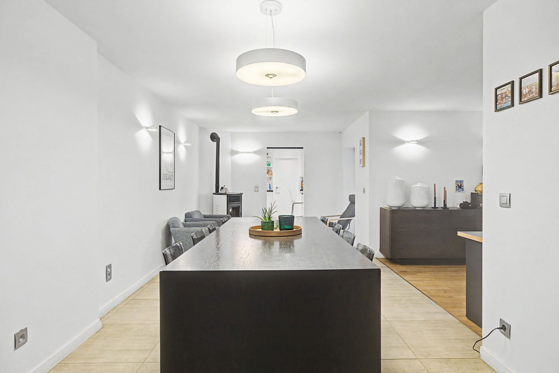 De woning verwelkomt u via een inkomhal en leidt naar een bijzonder gezellige woonkamer met houtcassette en prachtig zicht op de tuin en het zwembad met veiligheidsrolluik. Aansluitend bevindt zich de ruime eetplaats met pelletkachel en de ingerichte keuken. Verder is er een praktische berging/wasplaats met doucheruimte en een apart toilet.