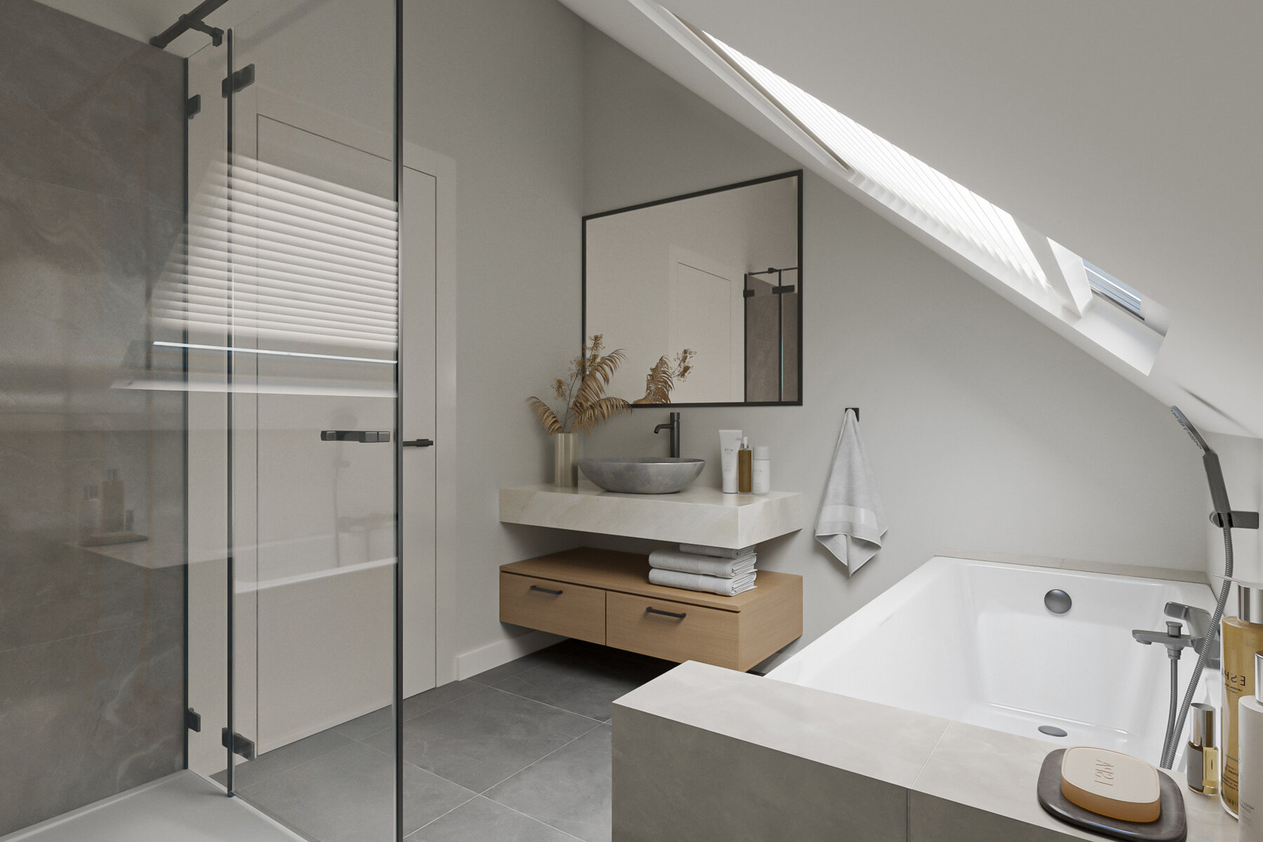 De woning beschikt over een inkomhal met vestiaire en gastentoilet. De lichtrijke leefruimte sluit naadloos aan op de open keuken met aangrenzende berging en wordt extra gekenmerkt door een open trap naar de bovenverdieping. Vanuit de woonkamer geniet u van een mooi zicht op het terras en de tuin, die ook rechtstreeks toegankelijk zijn. Aan de linkerzijgevel is een verharde parkeerplaats voorzien.