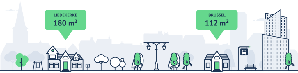 Op minder dan 30 minuten met het openbaar vervoer moet u naar het westen om de beste koopmogelijkheden in Vlaanderen te vinden, met veel lagere prijzen dan in de hoofdstad. Met een hybrideprijs van €2.012/m² is de Vlaamse gemeente Liedekerke het aantrekkelijkst (vergeleken met een gemiddelde van €3.341/m² in Brussel). Een huishouden met een budget van 350.000 euro kan gemiddeld een huis van 180 m² of een appartement van 149 m² kopen, hoewel deze laatste in deze regio zeldzamer zijn. Ter vergelijking: eenzelfde huishouden kan in Brussel rekenen op een huis van 112 m² en een appartement van slechts 101 m². Dit is een aanzienlijk verschil, want het betekent een winst van 68 m² voor een huis en maar liefst 48 m² voor een appartement.